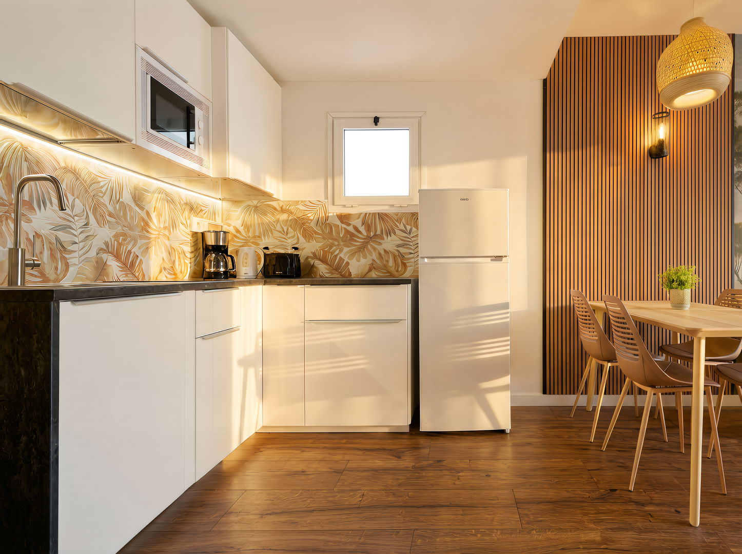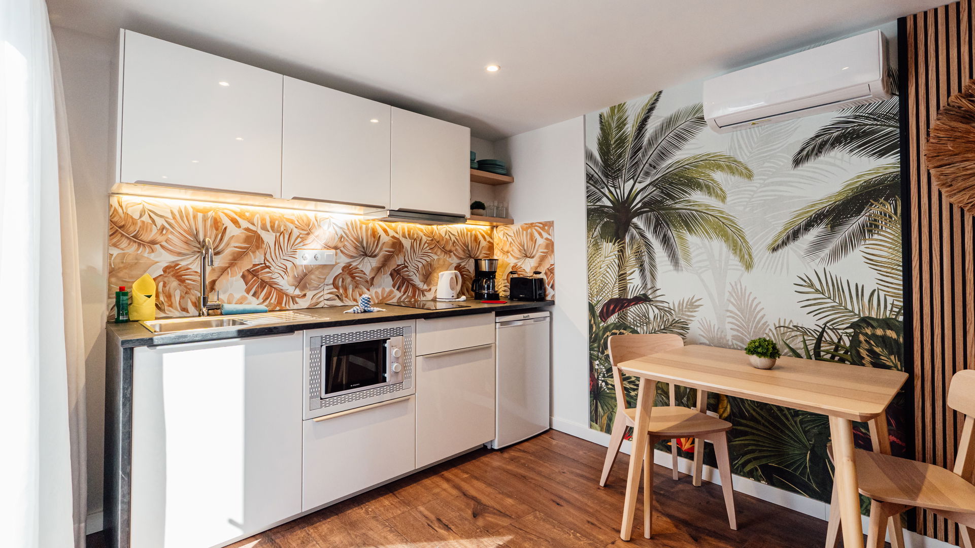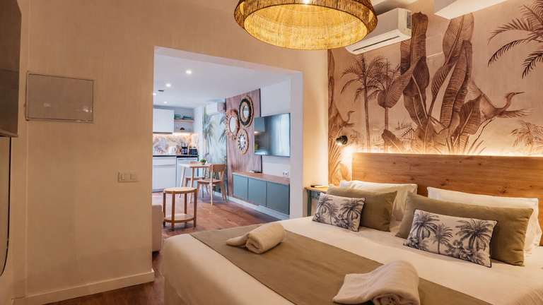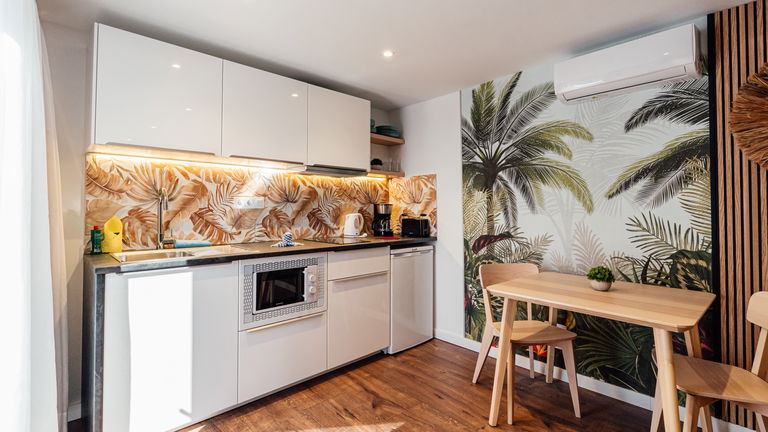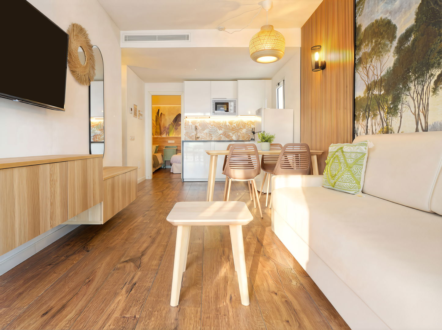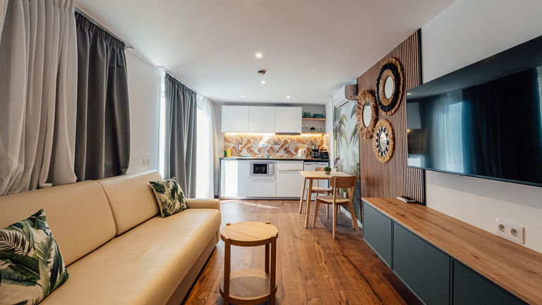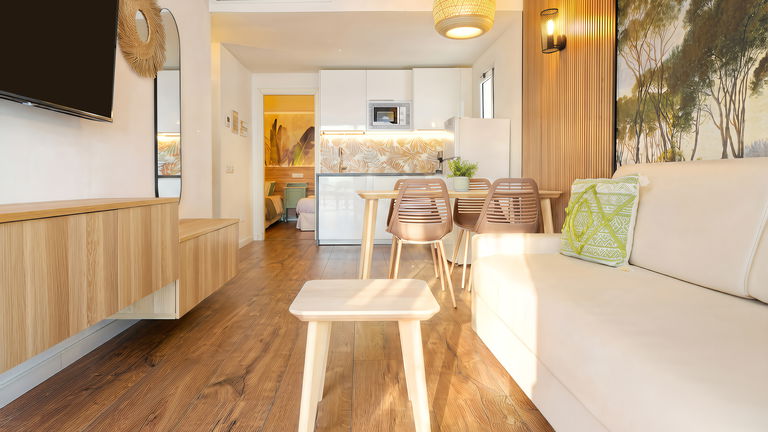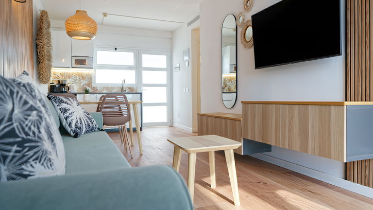 Apartamento de un dormitorio con dos camas, salón con TV, aire acondicionado. Cocina equipada con microondas, nevera y cafetera. Mesa de comedor en la zona de la cocina. Balcón.
