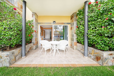 Las habitaciones de la planta superior tienen 3 balcones o y las de la planta inferior 2 terrazas, con vistas al campo de golf o a las dunas de Maspalomas.