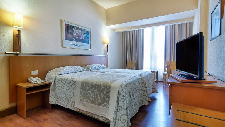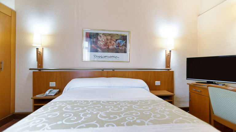 Lit simple de 1,30 m, vue extérieure. Coffre-fort (en location), téléphone, télévision par satellite, climatisation, Wi-Fi, douche, articles de toilette et sèche-cheveux.